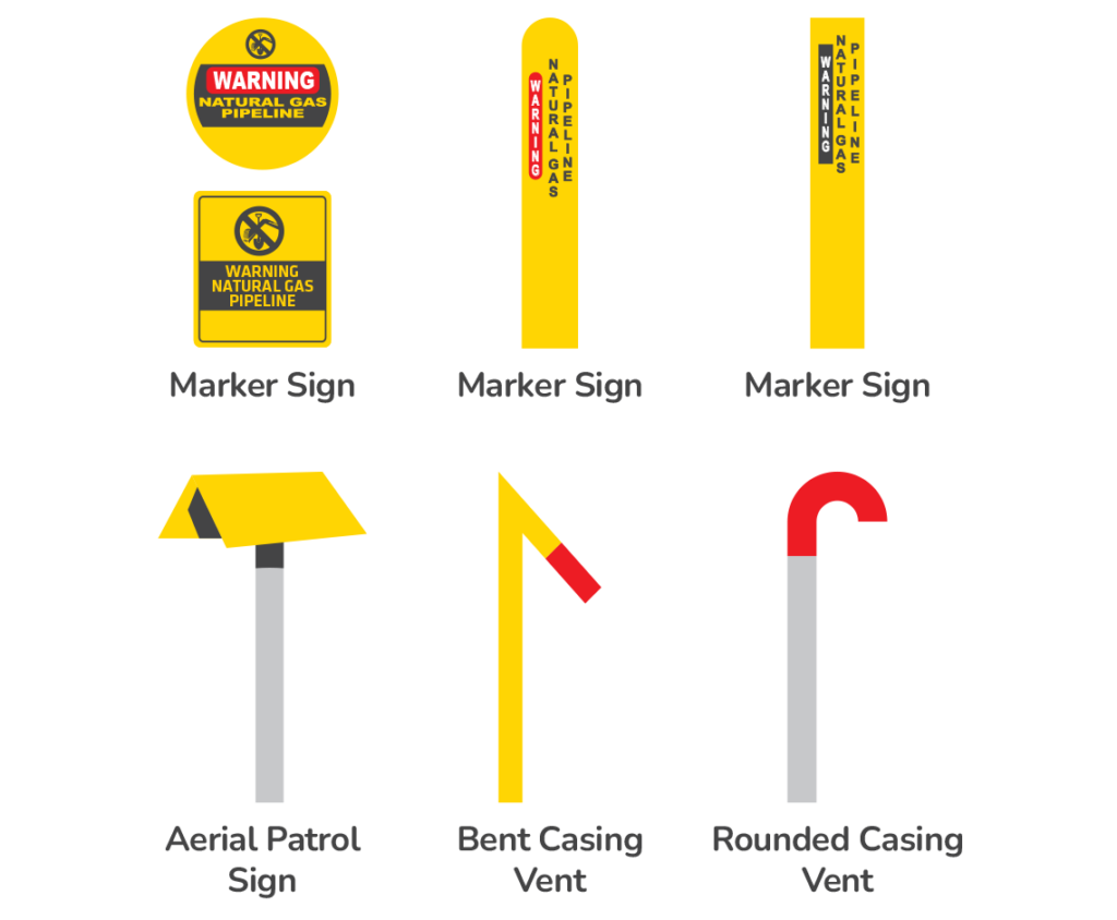 Pipeline markers are used as warning signs to indicate the presence of a pipeline. However, these markers do not show the exact location or depth of a pipeline and are not present in all areas. Additionally, the pipeline path may vary between markers. Pipeline markers are helpful providing the general location of pipelines, but pipeline operators rely on special equipment and service records to determine the exact location and depth of pipelines installed underground. Since these signs don't indicate their exact location, you are required to contact 811 to have the lines marked before any excavation activity.